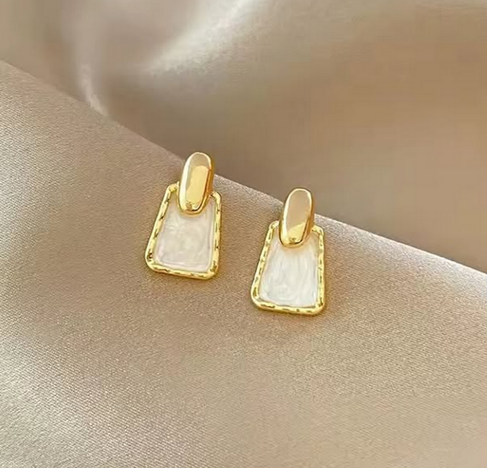 Discover modern elegance with our Geometric White Enamel Drop Earrings. These stylish earrings feature a captivating design, combining a sleek, polished gold-tone curved top piece that connects to a bold, rectangular drop element. The rectangular portion is beautifully filled with a smooth, pearlescent white enamel, creating a striking contrast with the gold frame. The clean lines and contemporary aesthetic make these earrings incredibly versatile, suitable for both professional settings and casual outings. Their lightweight construction ensures comfortable wear throughout the day, adding a refined touch to your look without feeling heavy. These eye-catching and fashion-forward earrings are an ideal accessory for those who appreciate minimalist yet impactful jewelry.
